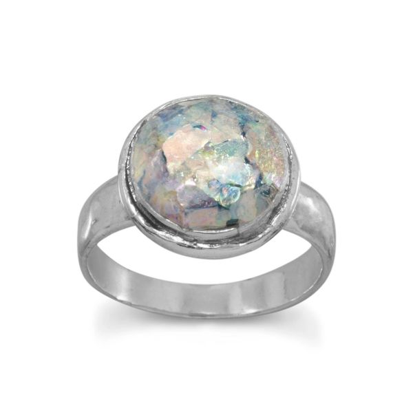 Oxidized sterling silver ring with 11mm round ancient Roman glass center piece and hammered slightly graduated band that comes to a 3.3mm width in the back. This ring is available in whole sizes 5-9. Ancient Roman glass coloring will vary.